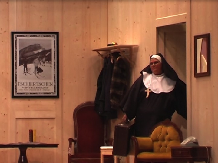 Frau Hartmann macht sehr viel für ihre Pensionäre, was aber nicht sehr geschätzt wird. Es wird alles anders, als Frau Hartmann für drei Wochen zur Kur fährt. Ihre Schwester Nora springt in dieser Zeit für sie in der Pension ein. Zum Leidwesen der Mieter ist Nora aber eine Nonne. Dieser Pinguin, wie die Ordensschwester genannt wird, bringt einen ganz anderen Wind in dieses Haus. Nun merken alle, was sie an der lieben Frau Hartmann haben. Frau Amsler ist ein dankbares Opfer für allerlei Streiche. Wegen ihrem geistigen Zustand merkt die Arme nicht einmal, dass ihr über alles geliebter Kanarienvogel Hansi tot ist. Sie glaubt, er sei müde und ruhe sich nur etwas aus.