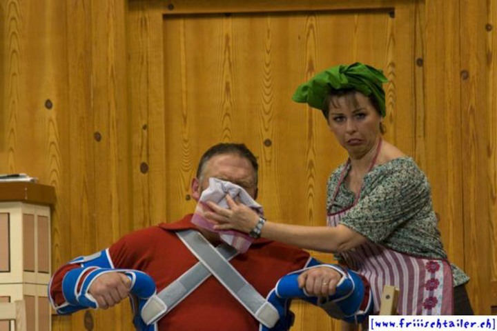 Toni Burri hat sich verschlafen. Er sollte eigentlich schon lange im Zug nach Bern sitzen, um dort an einer Sitzung des Bauernverbandes teilzunehmen. Seine Frau Theres möchte diesen Anlass dazu nutzen, ihren Mann für einige Zeit zu verlassen, um ihn so in die Knie zu zwingen, dass er sich von seinen vielen «Ämtli» und Vereinen trennt und sich mehr um sie kümmert. Als der Bruder Theres abholen will, Toni immer noch auf dem Hof ist, kommt es zu den ersten Komplikationen, denn Toni darf ja nichts Avon wissen, dass ihn seine Frau verlassen will. Dori, die Hausangestellte, eine mehr als «giftige» Person freut sich natürlich, nun das Zepter führen zu können. sie blüht geradezu auf um jeden zu tyrannisieren, der auf dem Hof anwesend ist. Der Nachbar, der die Situation dass Theres nicht mehr da ist, ausnutzen möchte, hat über Internet an zwei Damen geschrieben. Diese kommen nun am Wochenende auf den Hof, um ihren Märchenprinzen kennen zu lernen. Die zwei Internet-Damen haben aber die Rechnung ohne Dori gemacht. Da die beiden Damen nicht dem entsprechen, was sich der Nachbar vorgestellt hat, verleugnet er sich. Nun muss auch er unten durch, damit Dori den Schwindel nicht aufdeckt. Wer nicht nach ihrer Geige tanzt, wird heruntergehandelt wie ein «Schuelergoof». Ganz schlimm wir es, als Toni die Kellertreppe hinunterstürzt und auf fremde Hilfe angewiesen ist. Er ist heilfroh, dass Theres endlich wieder zurück kommt.